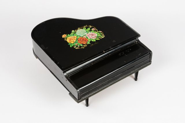 Piano à queue miniature noir à trois pieds. Sous le piano, les trois pieds sont fixés à des planches de contreplaqué peintes en noir qui semblent être une réparation après fabrication. Le piano est décoré sur le dessus d’un appliqué à motif de roses rouges, bleues, jaunes et roses entourées d’une portée musicale. Plusieurs retouches de peinture noire ont été faites sur la surface du piano. Il comprend deux octaves et demie.