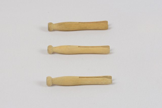 Pince à linge jouet en bois, la partie inférieure présente une fente qui permet de fixer les étoffes et la partie supérieure se termine par un renflement.