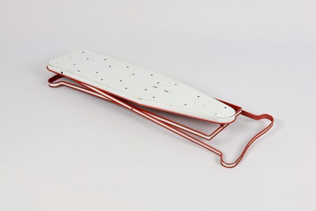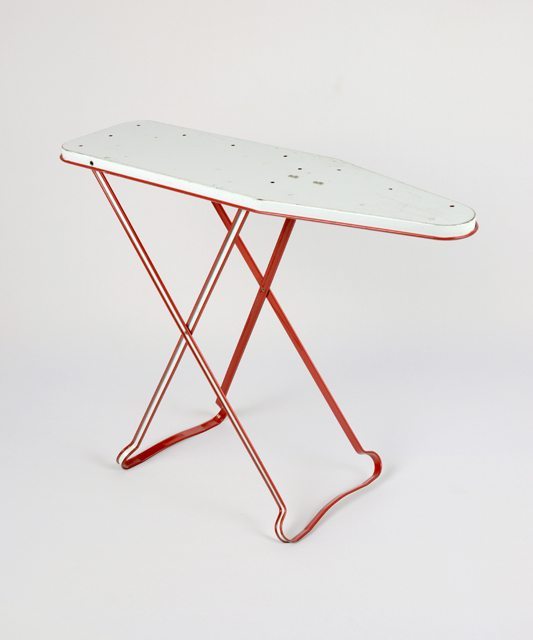 Petite planche à repasser en métal peint en rouge et blanc. La planche a des trous sur son plateau. En dessous, il y a deux butées pour insérer les pattes pliables.