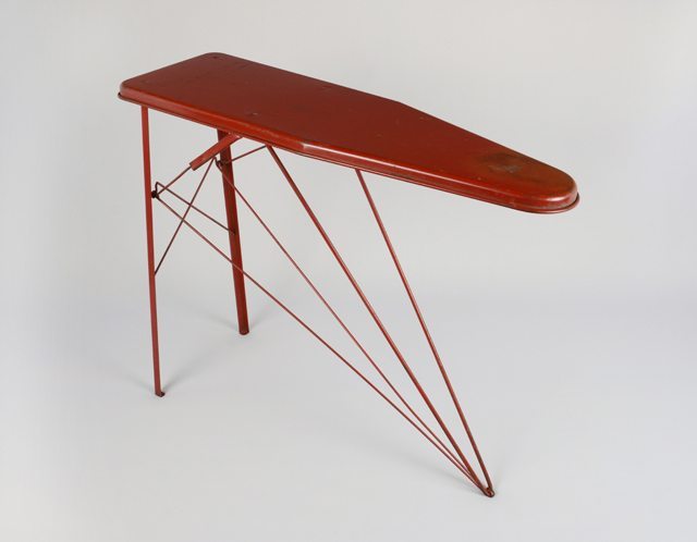Planche à repasser jouet en métal rouge. Les pattes se replient en dessous pour le rangement.