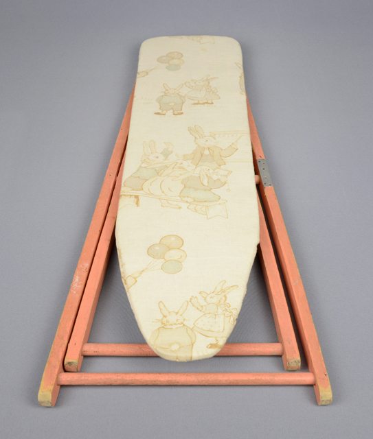 Planche à repasser jouet avec un corps de bois recouvert de tissu de couleur écru serré sur la planche par une corde blanche en dessous. Le recouvrement en tissu présente des motifs de lapins et de ballons ayant des couleurs délavées. Les pattes de la planche à repasser sont en bois de couleur rose. La première paire de pattes croise la seconde par un axe central de bois. Une butée est fixée sous la planche.
