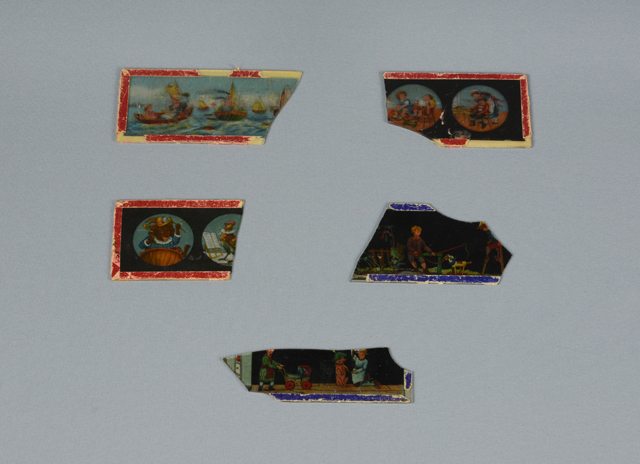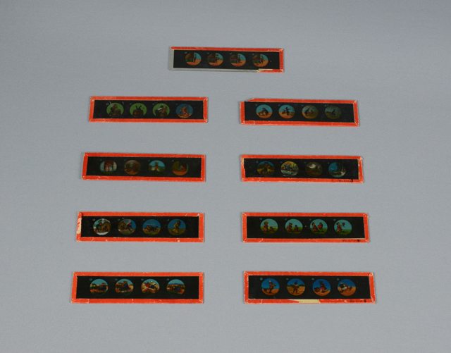Plaquette de verre avec des séries d’images à sa surface. La plaquette a un rebord en papier rouge collé au verre.