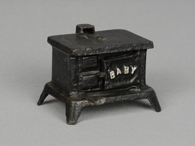 Poêle en fonte noire miniature avec une inscription sur la porte en relief peint en blanc. Derrière, il y a un ruban beige avec une inscription au feutre noir.