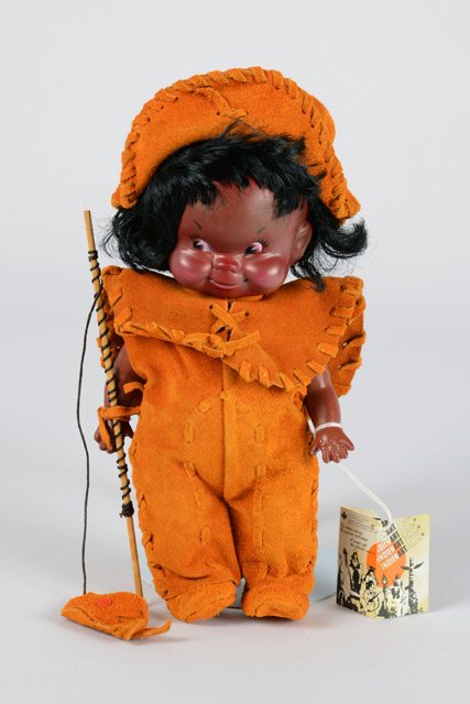 Poupée à la couleur de peau foncée, vêtue d’un costume amérindien représentant un pêcheur. Le costume est en cuir suédé brun-orangé composé d’une combinaison-pantalon frangée, d’un large col descendant au dos surpiqué d’un filin de cuir suédé, de mocassins et d’un chapeau en cuir suédé. Ses cheveux sont noirs en fibres synthétiques. Elle porte à la main gauche une canne à pêche en bois naturel et un poisson en cuir retenu par un fil noir. Une étiquette est attachée à son poignet gauche.