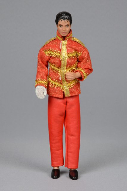 Poupée en plastique d’homme à la peau foncée. Les traits du visage sont peints : les yeux sont noir sur blanc et les lèvres sont roses. Les cheveux sont peints en noir et font partie du moulage de la tête. Il porte une veste rouge et or avec des galons dorés, un pantalon en cuirette rouge, un gant blanc et argenté à la main droite et des chaussures noires. La tête, les bras, les hanches les jambes et les genoux sont articulés.