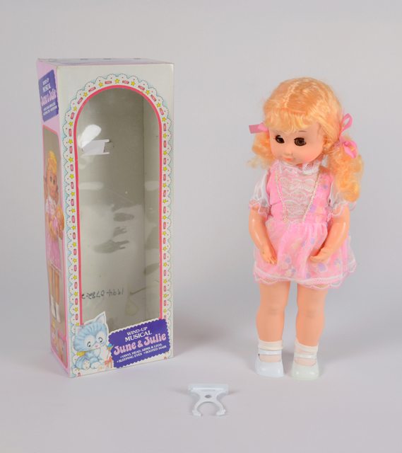 Poupée fille aux cheveux longs blonds-roux avec couettes de chaque côté de la tête fixées par des rubans roses. La poupée a les yeux bruns qui se ferment au mouvement de la tête. La poupée porte une robe rose ornée de dentelle blanche et rose et se ferme à l’arrière par deux bandes de velcro, une petite culotte jaune, des bas blancs et des souliers blancs. Un remontoir métallique est installé au niveau du postérieur. Ses bras sont placés de sorte de porter un bébé.