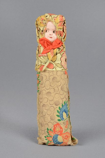 Poupée au visage de plâtre peint en rose, aux yeux noirs et aux lèvres rouges. Elle porte un foulard de tissu beige au motif floral rose, jaune et vert et de tissu rose corail. Elle porte une robe de tissu brun au motif floral orange, bleu et vert. Le corps de la poupée est rembourré de sciure de bois.
