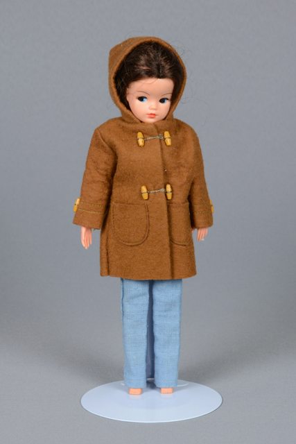 Poupée aux cheveux longs bruns. Ses yeux sont peints en blanc, bleu et noir et ses lèvres en rose. Elle porte un manteau de feutrine brune avec deux poches à l’avant et un capuchon. Elle porte également un pantalon bleu pâle. La tête, les bras, les poignets, la taille et les jambes sont articulés.