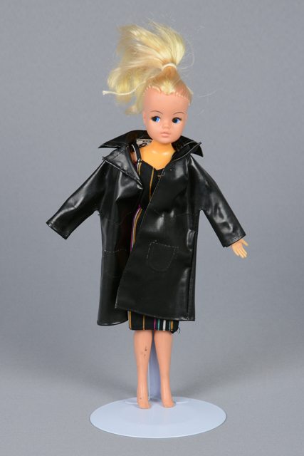 Poupée aux cheveux blonds longs. Ses yeux sont peints en blanc, bleu et noir et ses lèvres en rose. Elle porte une robe noire à bretelles avec des rayures verticales de couleurs roses, vertes, brunes et blanches. Elle porte également un imperméable noir. La tête, les bras, les poignets, la taille et les jambes sont articulés.