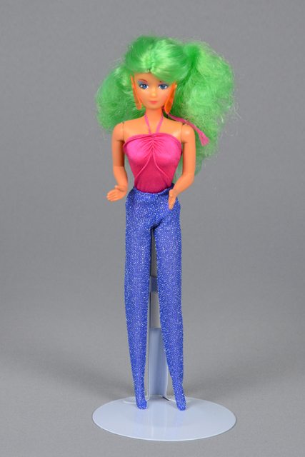 Poupée aux cheveux verts longs. Ses yeux sont peints en blanc, bleu et noir avec les paupières en bleu et rose et ses lèvres sont peintes en rose. Elle porte des boucles d’oreilles en plastique orange, un maillot de bain rose attaché au cou et un pantalon bleu avec des reflets argentés. La tête, les bras et les jambes sont articulés.
