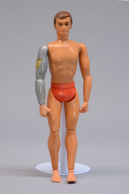 Poupée homme aux cheveux peints en brun et à l’oeil droit peint en blanc, bleu et noir. L’oeil gauche est en plastique transparent et l’on peut voir au travers par un trou derrière la tête de la poupée. Le bras droit est peint en gris et comprend des insertions de représentations de circuits électriques derrière du plastique transparent. Il porte une culotte rouge et une ceinture moulées à même la figurine. Il y a un levier rouge dans le dos à gauche. La tête, les bras, les doigts de la main droite et les jambes sont articulés.