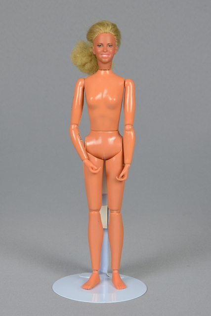 Poupée femme aux cheveux longs blonds. Ses yeux sont peints en blanc, gris et noir. Ses lèvres sont peintes en blanc et ses dents en blanc. Elle a un trou dans l’oreille droite. Au bras droit se trouvent des imprimés représentant des circuits électriques sous des plaques de plastique transparent. Une plaque se trouve entre l’épaule et le coude, l’autre se trouve à l’intérieur de l’avant-bras. Des imprimés similaires se trouvent aux cuisses dissimulées sous des trappes beiges. La tête, les bras, les poignets, les jambes, les genoux et les chevilles sont articulés.