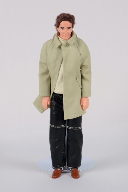 Poupée homme aux cheveux courts bruns et aux yeux peints en bleu, blanc et noir. Il porte un chandail à col roulé beige, un imperméable beige, un pantalon en cuirette noir à coutures blanches et des chaussures brunes.
