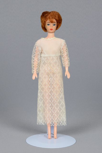 Poupée aux cheveux roux courts. Ses yeux sont peints en blanc, bleu et noir et ses lèvres en rouge. Elle porte une robe blanche en tulle avec des détails argentés. La robe se ferme à l’arrière à l’aide d’un bouton-pression en métal noir. La tête, les bras et les jambes sont articulés.