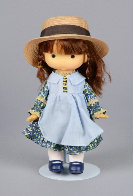 Poupée aux cheveux bruns longs avec des tresses. Elle porte une robe à motifs floraux bleus, verts et blancs sur fond bleu foncé, un tablier bleu pâle noué derrière la taille, un chapeau beige avec un ruban noir, des collants blancs et des chaussures de couleur bleu foncé en plastique. La tête, les bras et les jambes sont articulés. Les yeux sont noirs. La poupée vient avec sa boîte dont l’ouverture est en avant. Dans la boîte se trouve un imprimé d’un décor rappelant une scène de campagne.