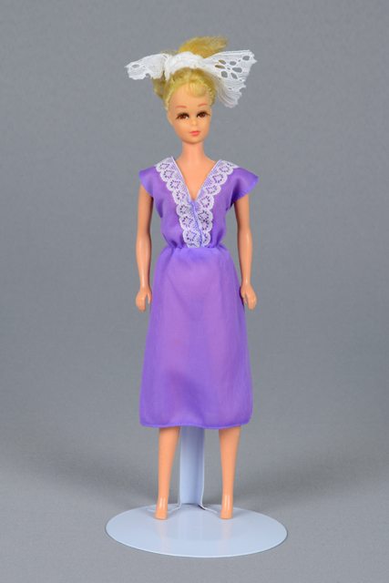 Poupée aux cheveux longs blonds avec une boucle en dentelle blanche qui retient les cheveux. Ses yeux sont peints en blanc, brun et noir et ses lèvres en rose. Elle a des cils bruns en fibre synthétique. Elle porte une robe mauve à encolure en « V » bordée de dentelle blanche. La tête, les bras et les jambes sont articulés.