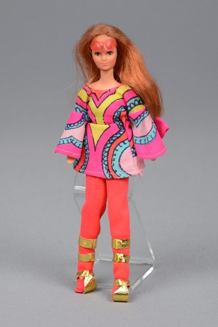 Petite poupée aux cheveux roux longs. Elle porte des lunettes de plastique rose attachées à la tête, une chemise à motifs en rose fluorescent, jaune, bleu, rouge et rose pâle. Elle porte aussi un pantalon rouge, des sandales dorées qui montent jusqu’aux mollets par-dessus le pantalon.