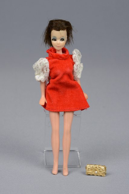 Poupée aux cheveux courts bruns, à la robe rouge avec des manches blanches et un sac à main doré avec une perle de plastique blanche comme bouton. La tête, les bras et les jambes sont articulés. Les traits du visage sont peints en bleu, blanc, noir et rose.