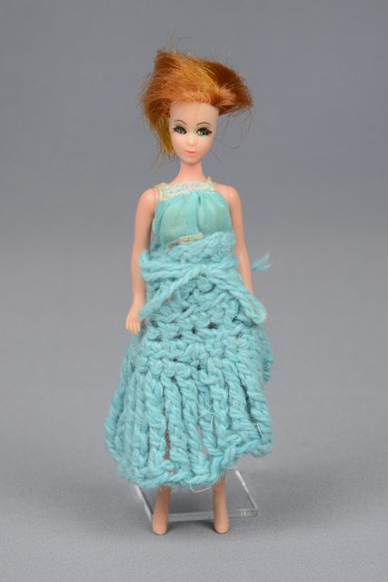 Poupée aux cheveux courts roux, à la camisole turquoise se fermant à l’arrière avec un bouton-pression et une jupe de laine tricotée bleue. La tête, les bras et les jambes sont articulés. Les traits du visage sont peints en bleu, blanc, noir et rose.