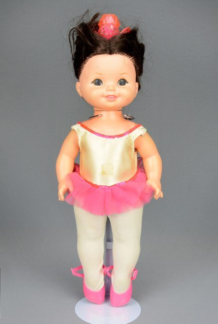 Poupée aux cheveux bruns coiffée d’une couronne de plastique rose vif. Elle porte une combinaison constituée d’un léotard blanc orné de paillettes roses, d’un tutu de tulle rose, et d’un bas collant blanc. Elle a des pointes de plastique rose vif aux pieds. La tête et les jambes sont articulées. Les yeux sont peints en brun, blanc et noir. Les lèvres sont peintes en rose.