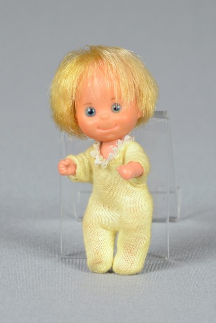 Petite poupée bébé aux cheveux blonds et aux yeux bleus. La poupée est vêtue d’une barboteuse jaune. Elle porte une inscription derrière la tête.