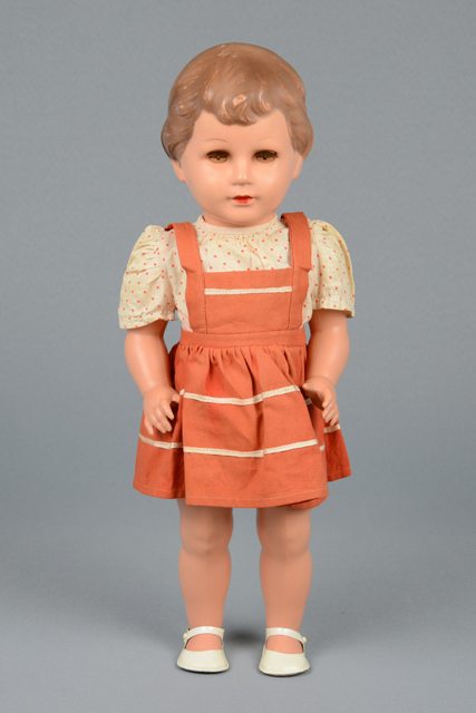 Poupée en plastique beige vêtue d’une petite culotte en tissu blanc, d’une jupe rouge à plastron, d’un chemisier blanc à pois rouges et de chaussures en plastique blanc. Les cheveux font partie du moulage de la poupée et sont peints bruns. Les yeux se ferment et il manque les pupilles. Les lèvres sont peintes en rouge. Entre les omoplates se trouve un logo en forme de losange avec une tortue au milieu.