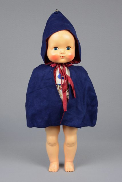 Poupée en plastique beige vêtue d’une petite culotte en tissu à motifs bleus, verts, rouges et jaunes avec une bordure de dentelle blanche, d’une robe de même tissu avec un plastron blanc bordé de bleu et d’une cape à capuchon bleu marin doublée de tissu rouge. Les cheveux font partie du moulage de la poupée. Les yeux en plastique blanc, bleu et noir se ferment lorsqu’elle est couchée. Les lèvres et les joues sont peintes en rouge.