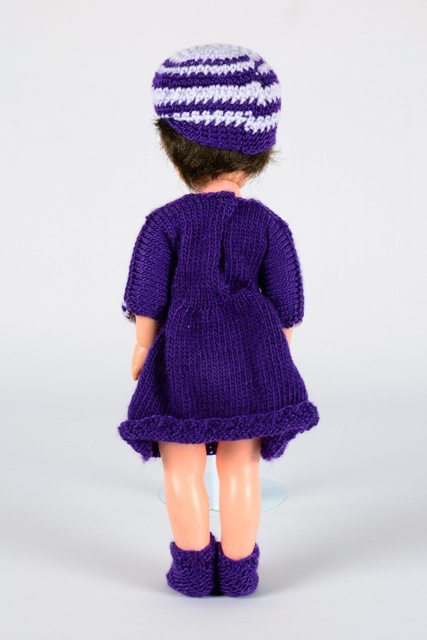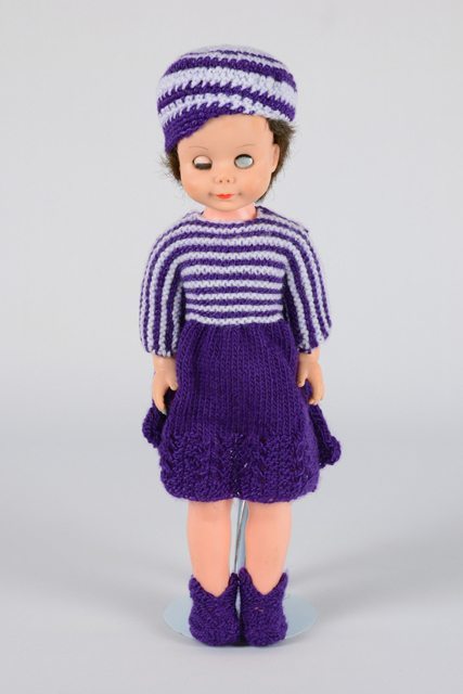 Poupée fille vêtue d’une robe de tricot mauve dont le corsage et les manches sont à rayures blanches et mauves, d’un chapeau à rayures, une culotte et des chaussettes en tricot mauve. Elle a les cheveux bruns foncés. Les yeux se ferment quand est couchée. Seul l’oeil gauche s’ouvre et a une pupille blanche.