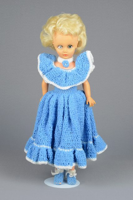 Poupée aux cheveux longs blonds. Elle porte une robe tricotée bleue avec des accents blancs et une petite culotte blanche et bleue. Elle porte à ses pieds des chaussons bleus et blancs. La tête, les bras et les jambes sont articulés. Les yeux sont peints en bleu et noir et se ferment lorsque la poupée est couchée. Les lèvres sont peintes en rose.