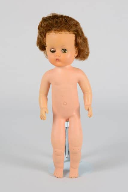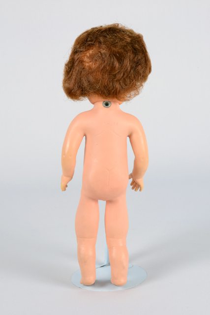 Poupée fille à la peau beige, aux cheveux bruns et aux yeux pers. La poupée est sans vêtements.
