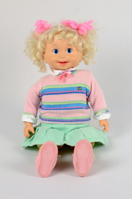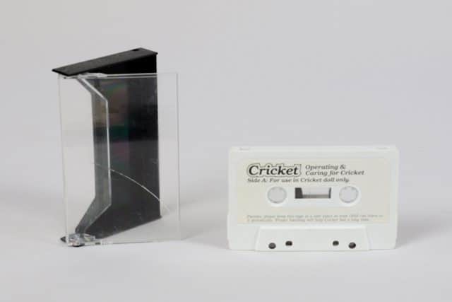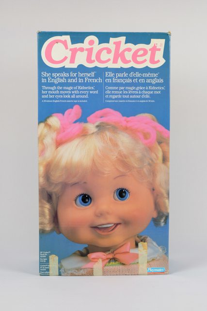 Poupée fille aux cheveux blonds longs avec des couettes de chaque côté fixées avec des rubans roses, portant un gilet en tricot de laine (?) rose avec lignes bleues, vertes et jaunes puis un insigne en forme de criquet collé à gauche sur la poitrine, une jupe verte, une petite culotte jaune, des bas blancs et des espadrilles roses et blanches, elle possède un magnétophone intégré dans le dos. Dans le dos se trouve un emplacement pour insérer quatre piles « C » et une pile de neuf volts. Inclus dans la boîte avec la poupée, on retrouve deux dépliants de garantie imprimés en turquoise et en noir sur carton blanc, deux cassettes dont une à l’intérieur de la poupée et une dans son étui.