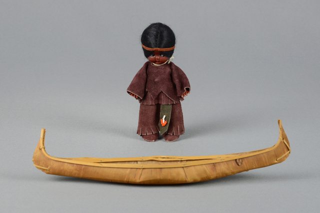 Poupée en plastique à la peau foncée. Elle est vêtue d’un costume de style amérindien en cuir suédé brun composé d’un pantalon, d’une veste, de souliers et d’un bandeau sur la tête. Les bas de pantalon et la veste sont frangés. Ses cheveux sont noirs et sont coiffés en queue de cheval. La ceinture est en cuir noir et est ornée de perles blanches et orange en verre. Les yeux peints en bleu et noir se ferment lorsque la poupée est couchée. Un canot en bois et en écorce accompagne la poupée. Les pièces sont retenues ensemble par des clous en métal et des lanières de bois.