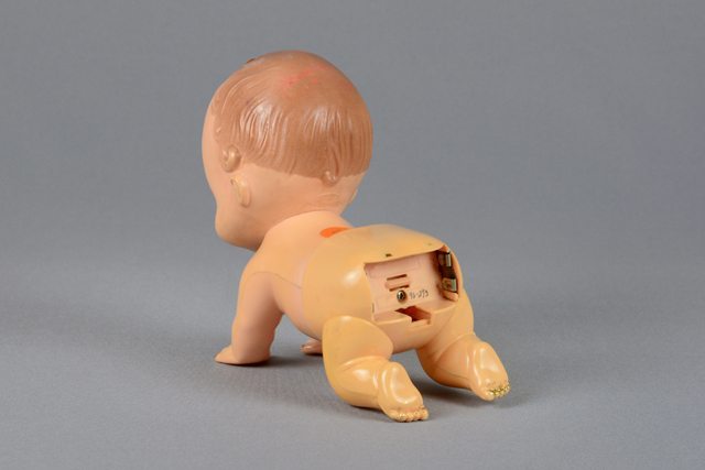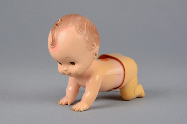 Poupée bébé en position accroupie sur les mains et les genoux. Un emplacement pour mettre des piles se trouve au postérieur. La tête est articulée et le bassin bouge selon le mécanisme. Un interrupteur se trouve sur le ventre. Les yeux sont peints en blanc, en bleu et en noir. Les cheveux sont peints sur le moulage de la tête en brun. Les ongles des mains et des orteils sont peints de jaune scintillant. Une pastille orange est collée sur le dos de la poupée.