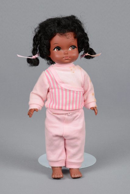 Poupée à la peau foncée et aux cheveux noirs attachés en deux tresses avec des rubans à cheveux roses. Les yeux sont peints en brun et noir puis les lèvres sont peintes en rose. Elle porte un chandail rose rayé en blanc et rose se fermant à l’arrière avec un bouton-pression et une bande de velcro. Elle porte un pantalon rose. La tête, les bras et les jambes sont articulés.
