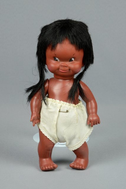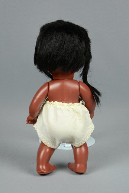 Poupée à la peau brune et aux cheveux noirs. Elle porte une petite culotte blanche avec une épingle de sûreté ternie. La tête, les bras et les jambes sont articulés.