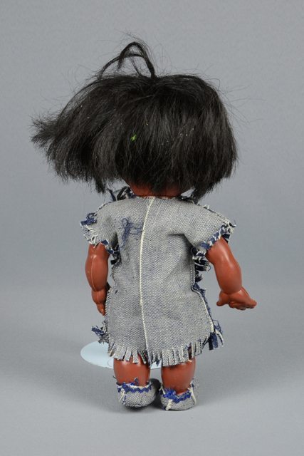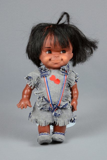 Poupée à la peau foncée et aux cheveux noirs. La robe est en denim bleu foncé rayé de très fines lignes blanches. La robe a des bandes rouges, bleues et blanches en forme de V sur la poitrine. Deux coeurs superposés sont collés sur la poitrine. Les mocassins sont en denim. Le cou, les bras et les jambes sont articulés.