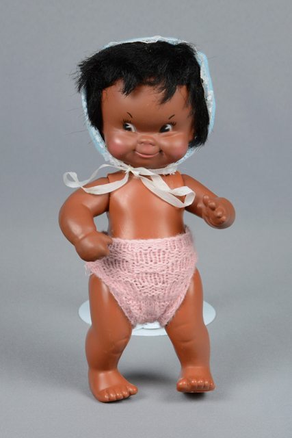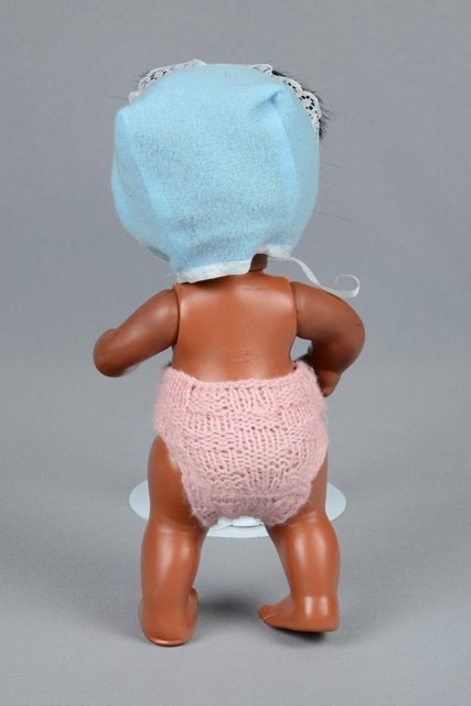 Poupée à la peau foncée et aux cheveux noirs. Elle porte un bonnet bleu poudre et une petite culotte tricotée en laine rose. La tête, les bras et les jambes sont articulés.