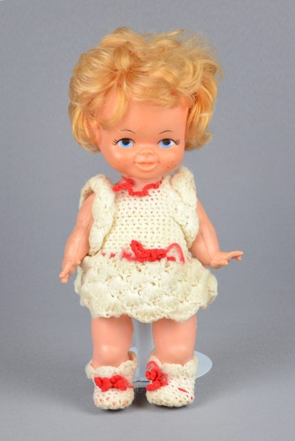 Poupée aux cheveux châtains courts. Elle porte une robe tricotée blanche avec un col et une ceinture rouge et une petite culotte en tricot blanc. Elle porte aux pieds des bottes en tricot blanc aux lacets rouges. La tête, les bras et les jambes sont articulés. Les yeux sont peints en bleu, blanc et noir. Les lèvres sont peintes en rose.