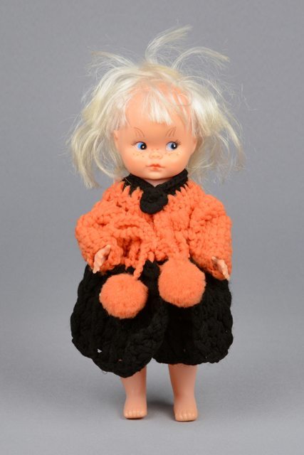 Poupée aux cheveux longs blonds. Elle porte une robe tricotée (en phentex ?) en noir et orange et une petite culotte blanche. La tête, les bras et les jambes sont articulés. Les yeux sont peints en bleu et noir. Les lèvres sont peintes en rose.
