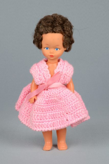 Poupée aux cheveux bruns courts. Elle porte une robe tricotée rose avec une boucle à l’abdomen et une petite culotte tricotée rose. La tête, les bras et les jambes sont articulés. Les yeux sont peints en bleu, blanc et noir. Les lèvres sont peintes en rose.