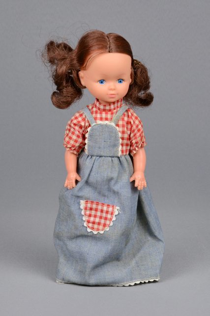 Poupée aux cheveux bruns longs vêtue d’une robe comprenant une chemise à carreaux rouge et d’une robe bleue avec une petite poche de tissu au même motif carreauté rouge que la chemise. Elle porte une petite culotte blanche et des souliers blancs en plastique. La tête, les bras et les jambes sont articulés. Les lèvres sont peintes en rose et les yeux sont peints en noir, blanc et bleu.