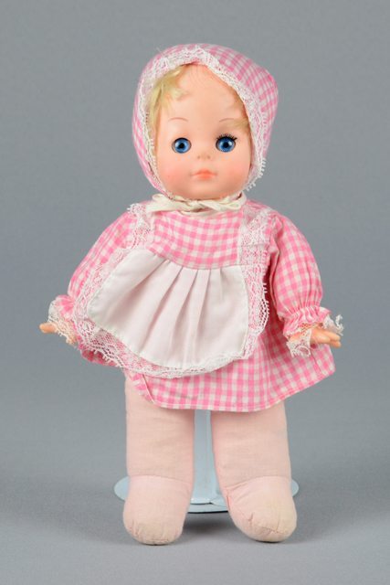 Poupée aux cheveux blonds. Elle est coiffée d’un bonnet et d’une robe en tissu à carreaux blancs et roses ornés de dentelle. La robe se ferme à l’arrière avec un bouton-pression blanc. La tête et les mains sont en vinyle tandis que le reste du corps est en tissu rose rembourré. Les yeux peints en blanc, bleu et noir se ferment lorsque la poupée est couchée. Les lèvres sont peintes en rose. Il manque les cils noirs de l’oeil droit.
