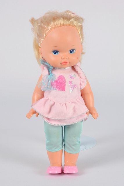 Poupée fille vêtue d’une robe en tissu rose avec des appliqués métalliques en mauve, rose et turquoise, bordée au bas et aux manches d’une fine ligne argentée. La poupée est aussi vêtue d’un pantalon turquoise et de chaussures en plastique rose. Elle a les cheveux blonds coiffés en queue de cheval avec une boucle de ruban rose. Elle a un coeur rouge sur la joue gauche et des coeurs mauves sur les oreilles.