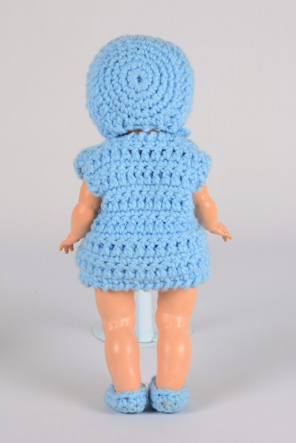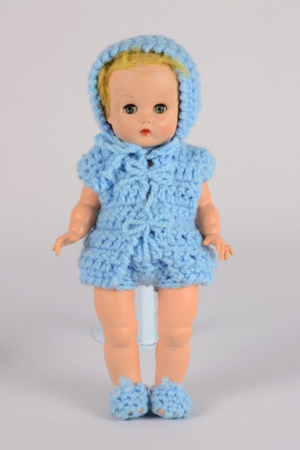 Poupée fille à la peau beige, vêtue d’une culotte courte, d’une veste, d’un chapeau et chaussures en tricot bleu. Elle a les cheveux blonds et les lèvres rouges.
