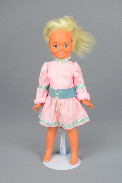 Poupée aux cheveux blonds partiellement tressés. La tresse peut être allongée ou raccourcie en tournant le remontoir au dos de la poupée. Elle porte une robe rose ornée de dentelle blanche, de ruban à motif floral blanc, bleu et vert et une ceinture de faux suède bleu. La tête, les bras et la taille sont articulés. Les yeux sont peints en bleu, blanc et noir. Les lèvres sont peintes en rose.