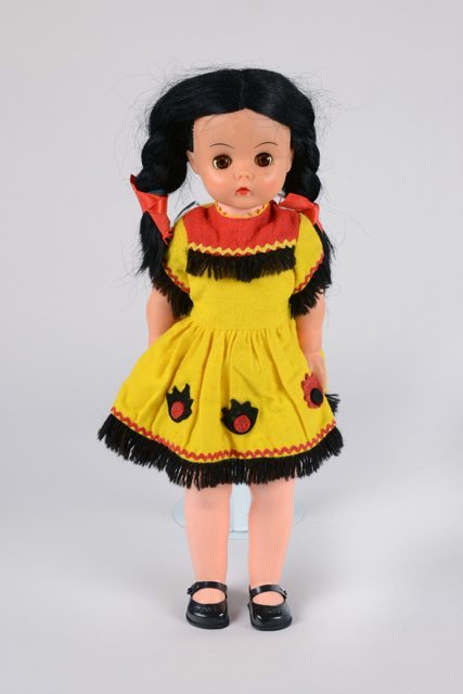 Poupée fille aux cheveux longs noirs, tressés de chaque côté de la tête et attachés avec des rubans rouges. La robe est jaune à franges brunes et aux motifs noirs et rouges, et se ferme avec deux boutons-pression dans le dos. Elle porte une petite culotte blanche et des chaussures noires. Les yeux sont bruns et se ferment lorsque la poupée est à l’horizontale.