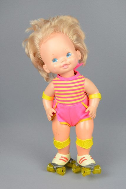 Poupée aux cheveux blonds. Elle porte un maillot rayé jaune et rose vif ainsi que des protège-genoux et protège-coudes jaunes. Elle a des patins à roulettes en blanc et rouge aux pieds. Elle fait du patin lorsque le remontoir dans le dos est actionné. La tête, les bras et les jambes sont articulés. Les yeux sont peints en bleu, blanc et gris. Les lèvres sont peintes en rose.