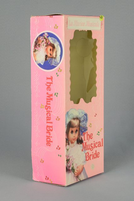 Poupée aux cheveux bruns et courts habillée en robe de mariée. La robe est blanche avec des volets, de la dentelle au col et aux manches. La poupée porte une petite culotte blanche, des bas blancs et des souliers en plastique blanc. Un petit levier remontoir est situé sur les fesses. Les yeux peints en vert, blanc et noir se ferment lorsqu’elle est couchée. Les lèvres sont peintes en rose. La poupée est dans une boîte de carton avec un couvercle en carton imprimé en rose et une fenêtre laissant voir dans la boîte.