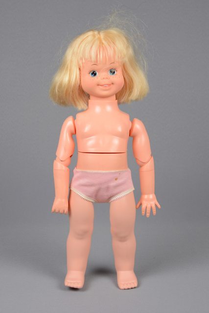 Poupée fille en plastique beige possédant des articulations aux coudes et la poitrine peut se tourner. Elle est vêtue d’une petite culotte en tissu rose bordée de dentelle blanche. Elle a les cheveux blonds en fibres synthétiques. Les yeux sont peints en blanc, bleu et noir, les lèvres en rose et les dents en blanc. Des taches de rousseur sont peintes sur les joues.