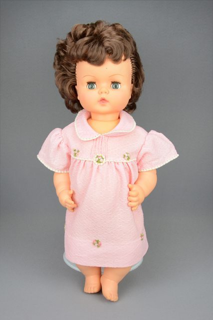 Poupée aux cheveux bruns. Elle porte une robe rose à bordures blanches, ornée de fleurs brodées en rose et vert. La tête, les bras et les jambes sont articulés. Les yeux se ferment lorsqu’elle est couchée. Les lèvres sont peintes en rose et trouées au centre.